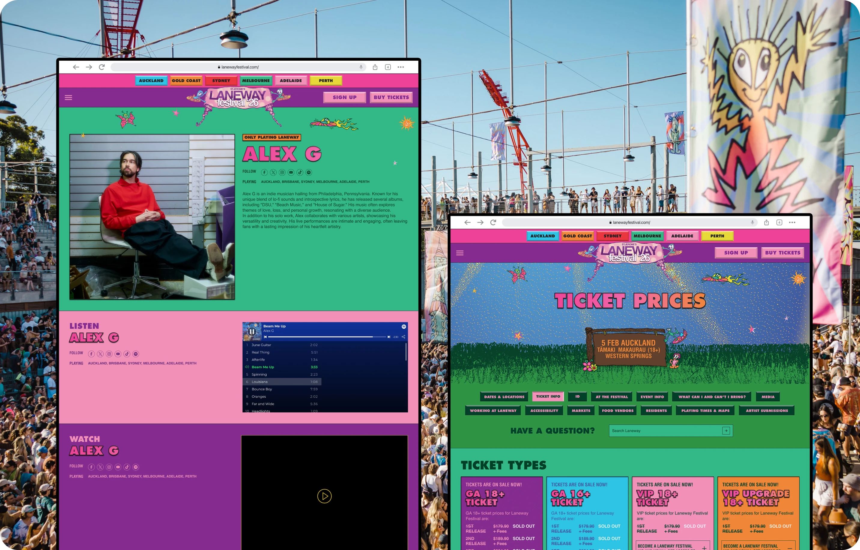 Rather than treating each season as a standalone project, we approached Laneway as a continuously evolving digital platform. Each year built on the last, allowing the website to adapt to new creative directions and operational needs without compromising stability, usability or accessibility.