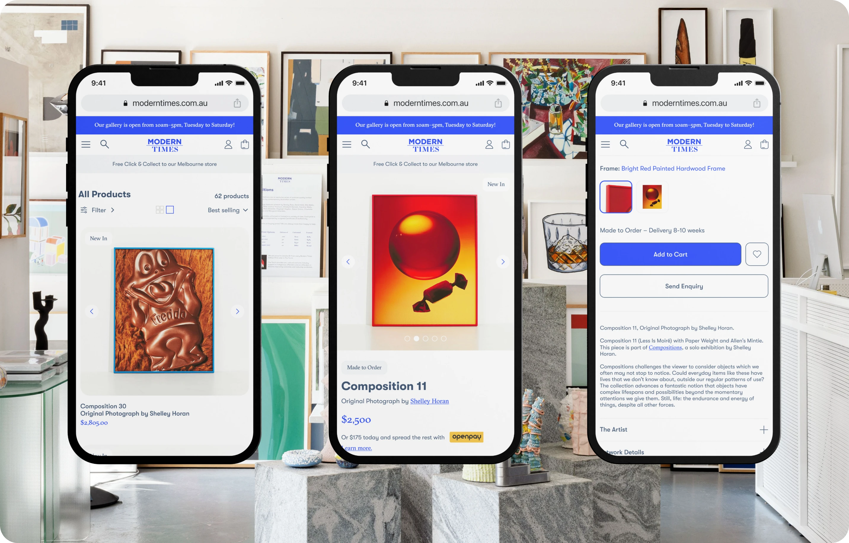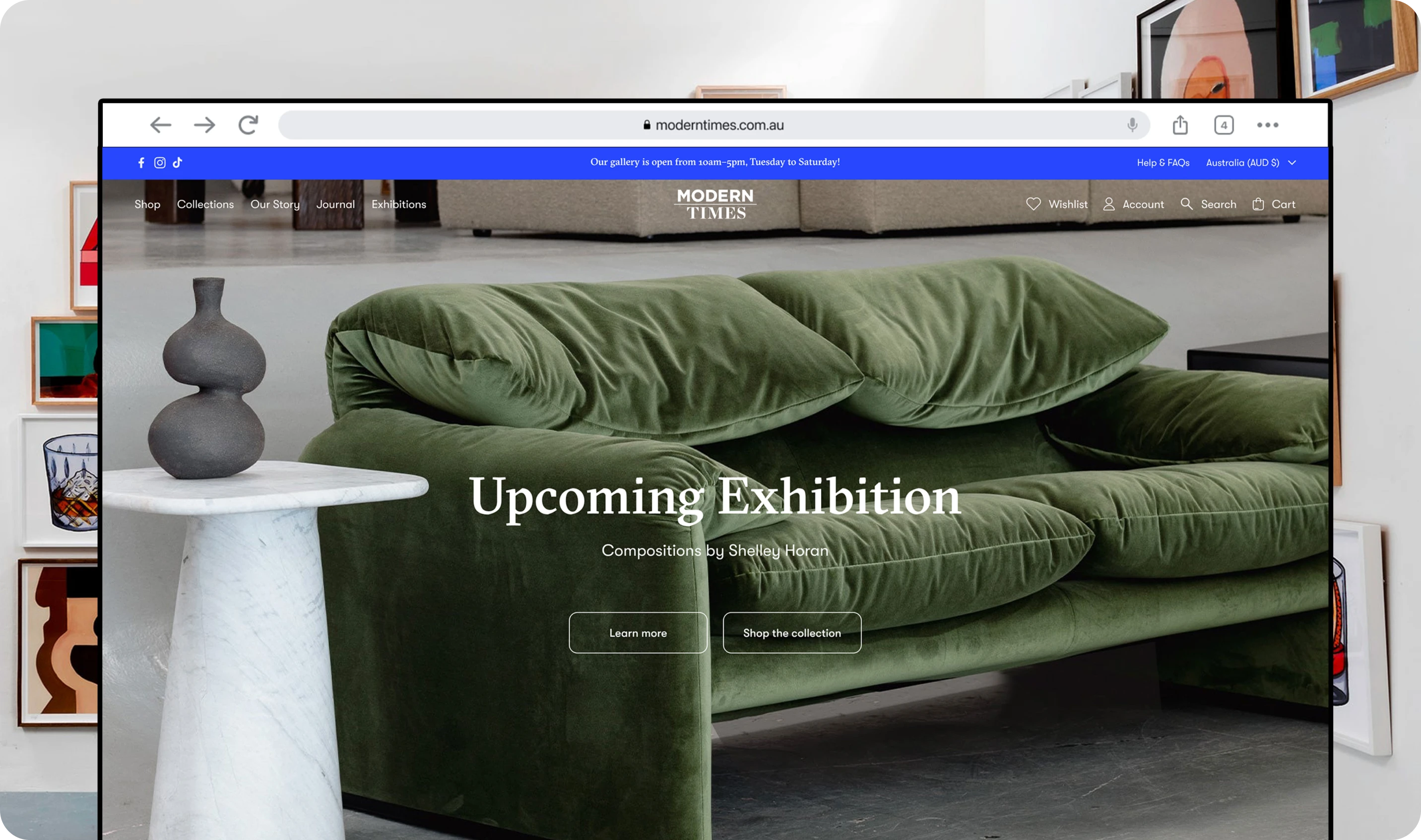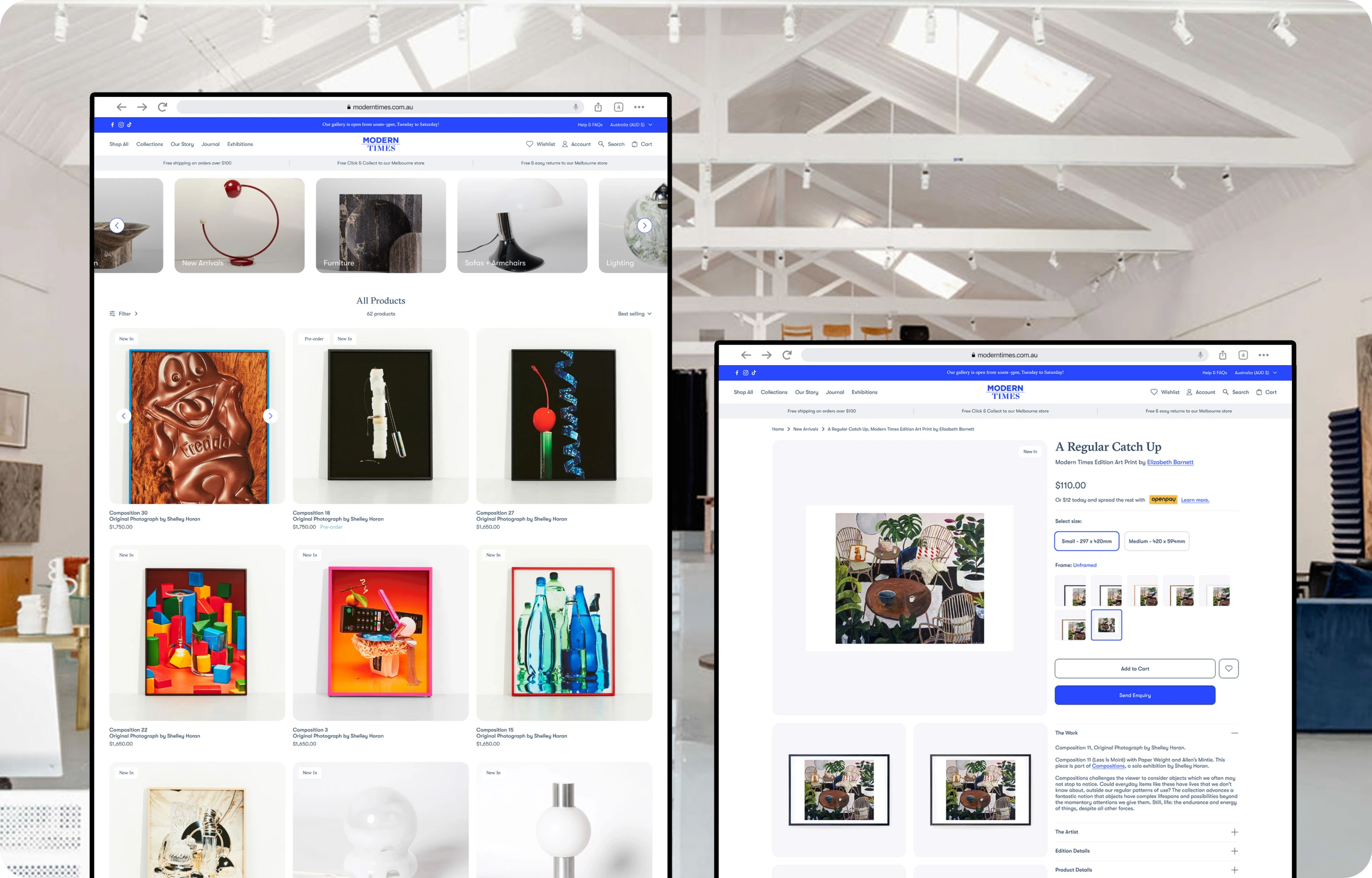 The user experience was overhauled to be intuitive and engaging. We prioritised ease of navigation and clarity in product presentation, ensuring that customers could effortlessly browse and appreciate the range of items offered. The website was designed to be a virtual extension of the Modern Times gallery, offering users a refined and unique shopping experience.
